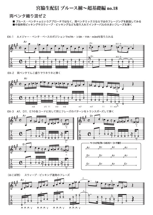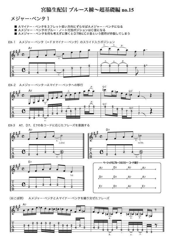 ■ ブルース進行の各コード(key=AでのA7、D7、E7)に対してマイナー&メジャー・ペンタを弾く
