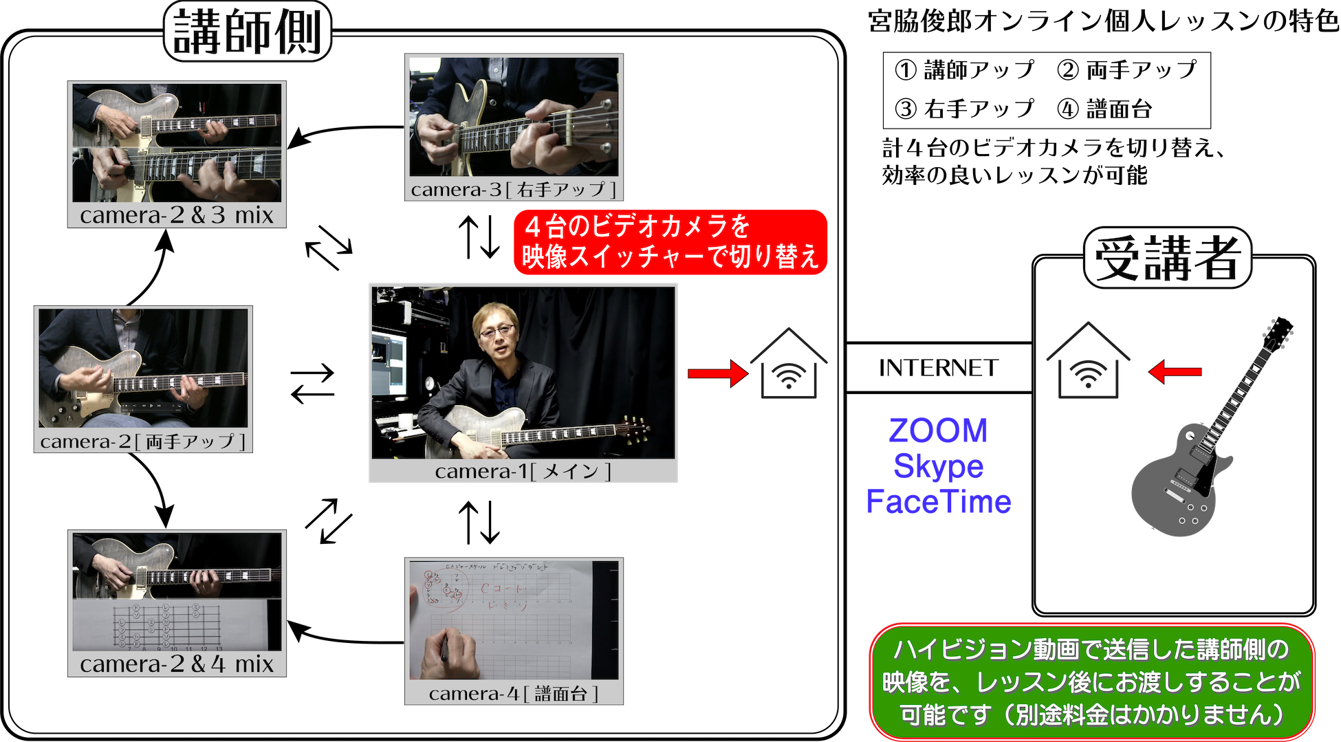 一般的なオンラインレッスンは、1台のカメラを使用した対面式ですが、当オンラインレッスンでは、下記4台のビデオカメラを映像スイッチャーで適宜切り替えながらレッスンを進めていきます。